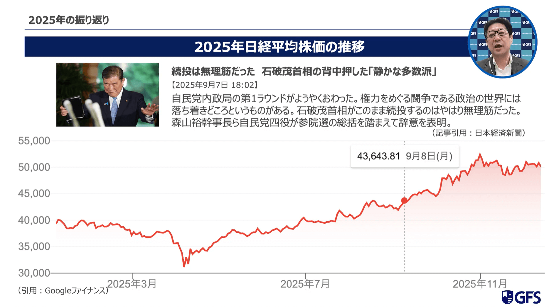 この動画の前半では、GFS校長の市川さんが、2025年に起きた投資イベントとそのイベントによる日経平均株価の推移を振り返っている。
