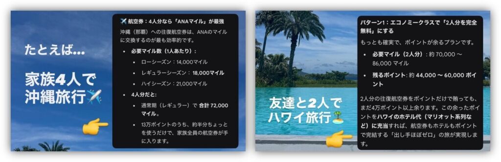 例えばこんな感じで、家族4人で沖縄に行っても、友達と2人でハワイに行ってもまだ余るほどのポイントだよ♪