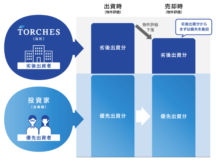 今回の品川区東大井5丁目ファンドでは、投資家の元本割れリスクを抑えるために「優先劣後方式」が採用されているよ。