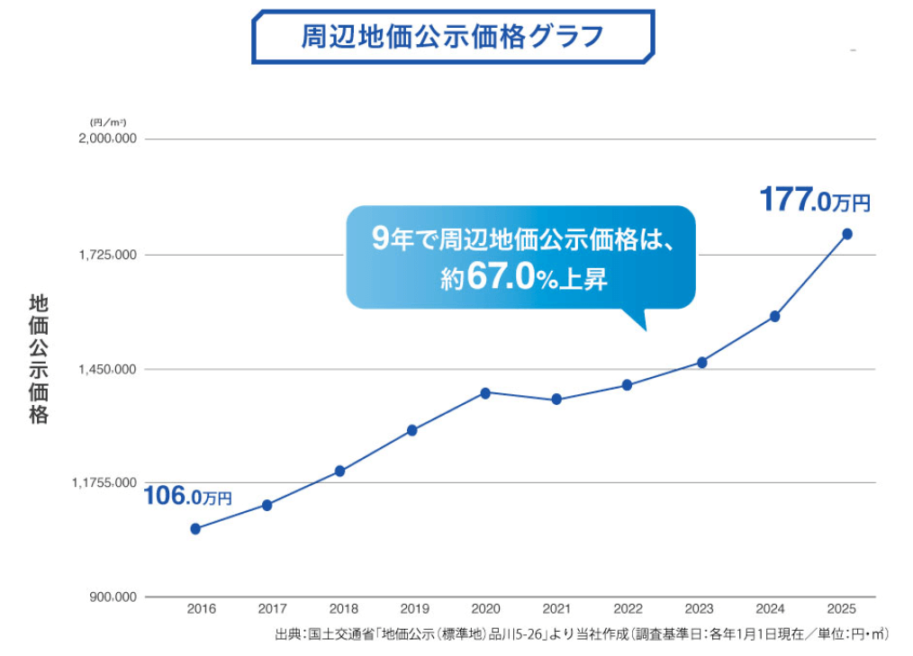 これだけ魅力的なエリアであることから、物件周辺の地価は過去9年間で67%も上昇中!